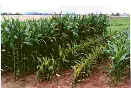 Abb. 1: Kümmerwuchs durch Inzuchtdepression bei Mais (Mitte) im Vergleich zur gesunden Elternlinie (links im Bild). Foto: Michael Fleck |